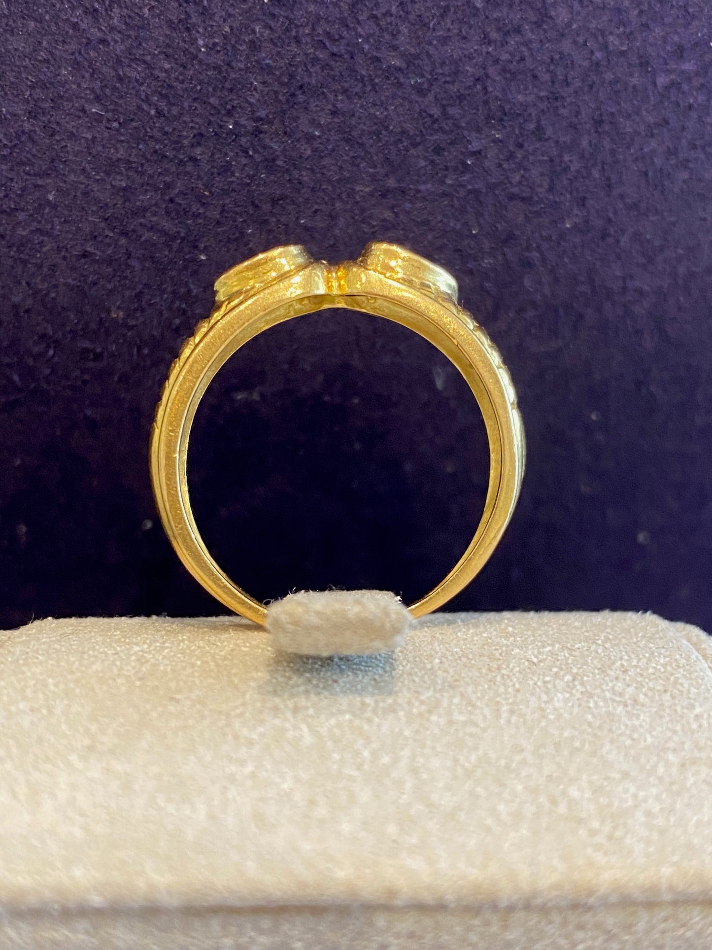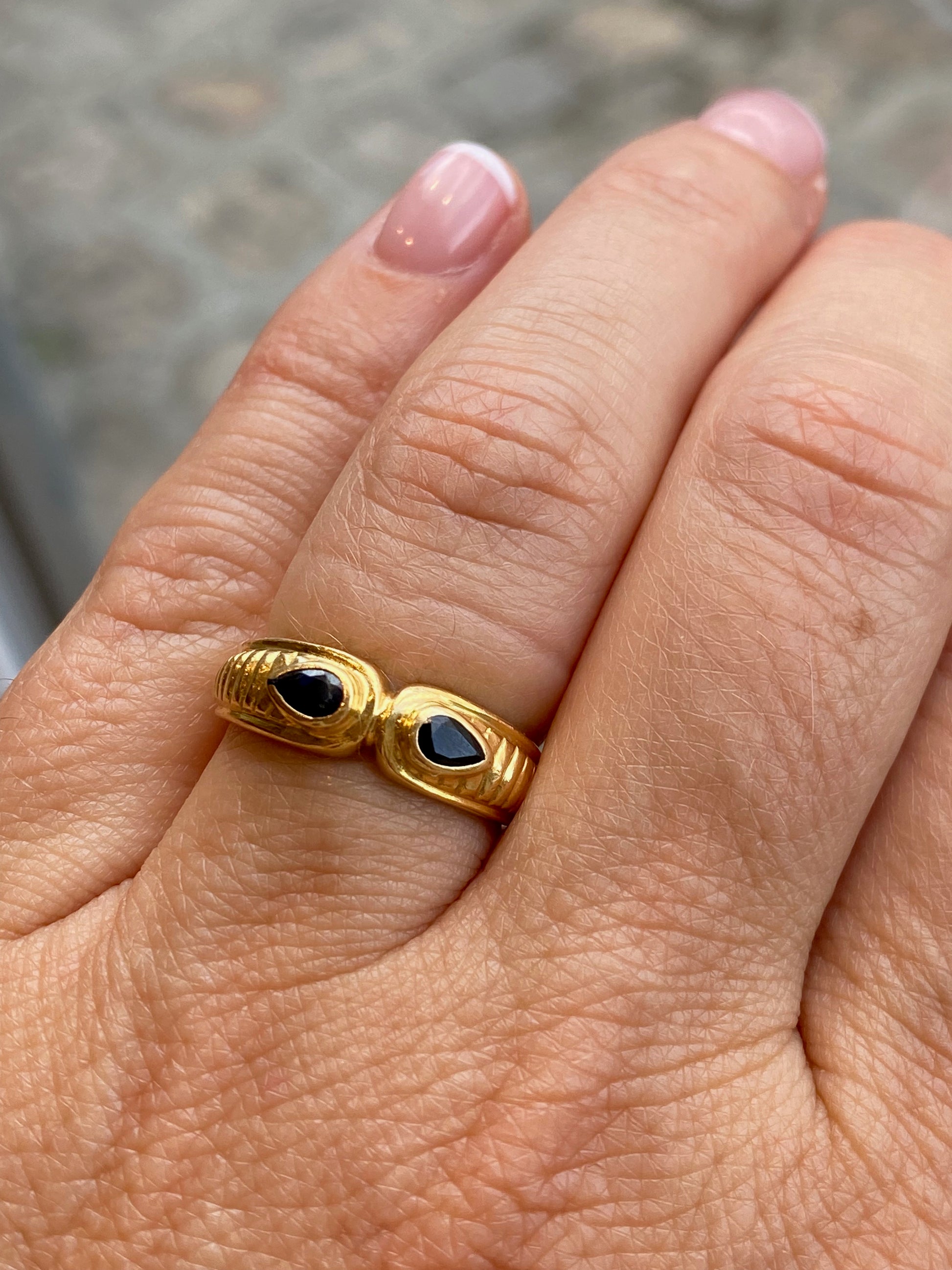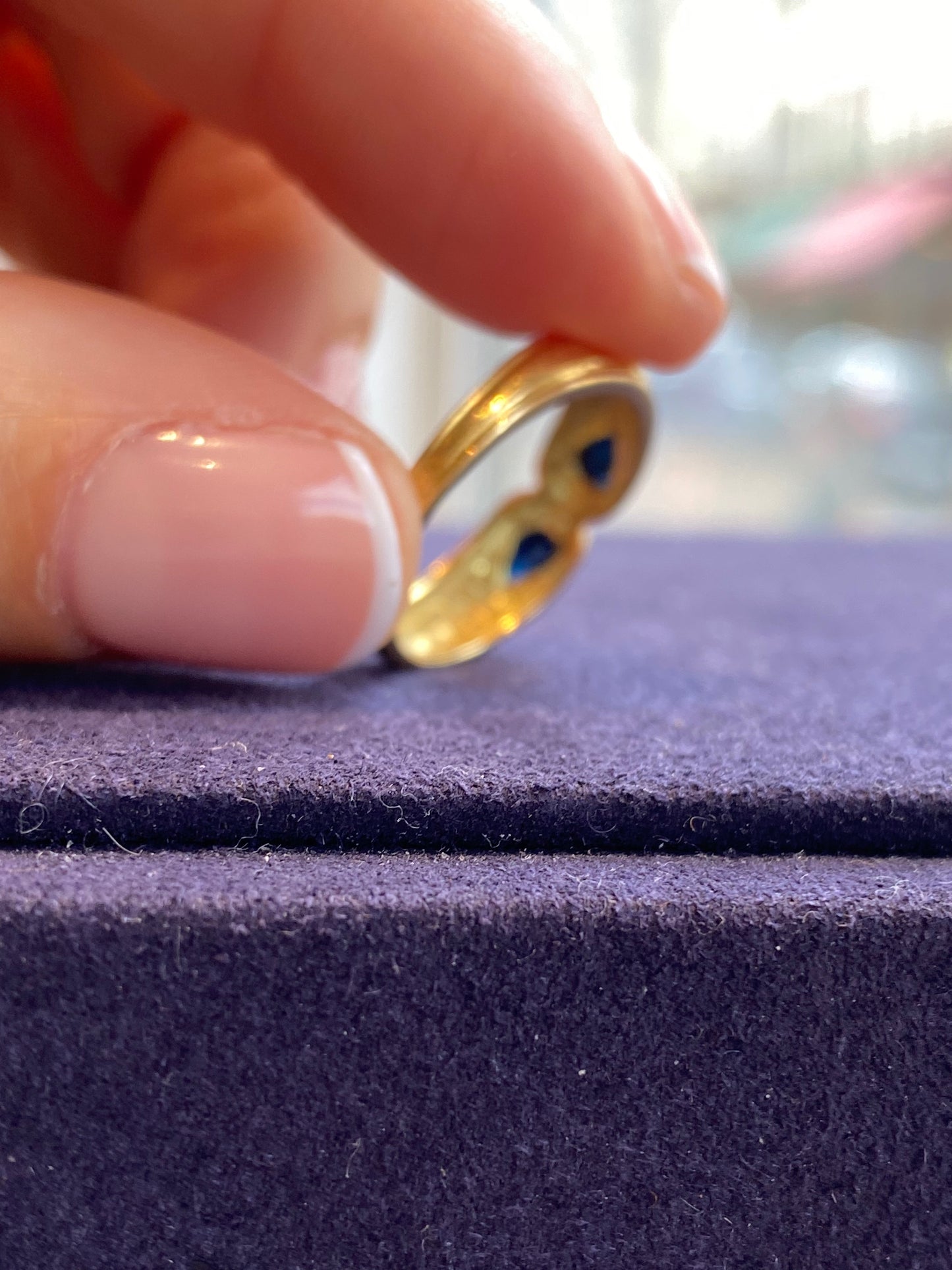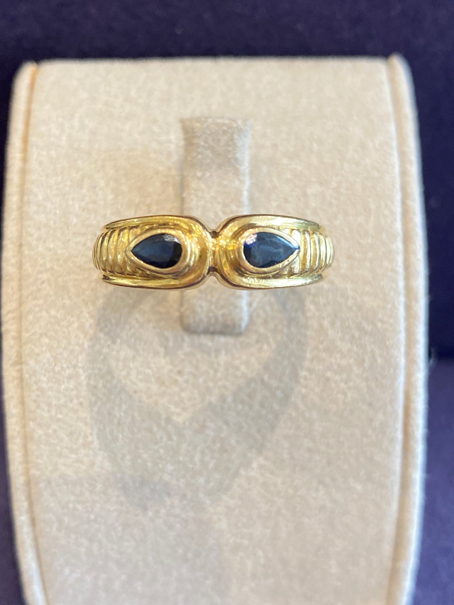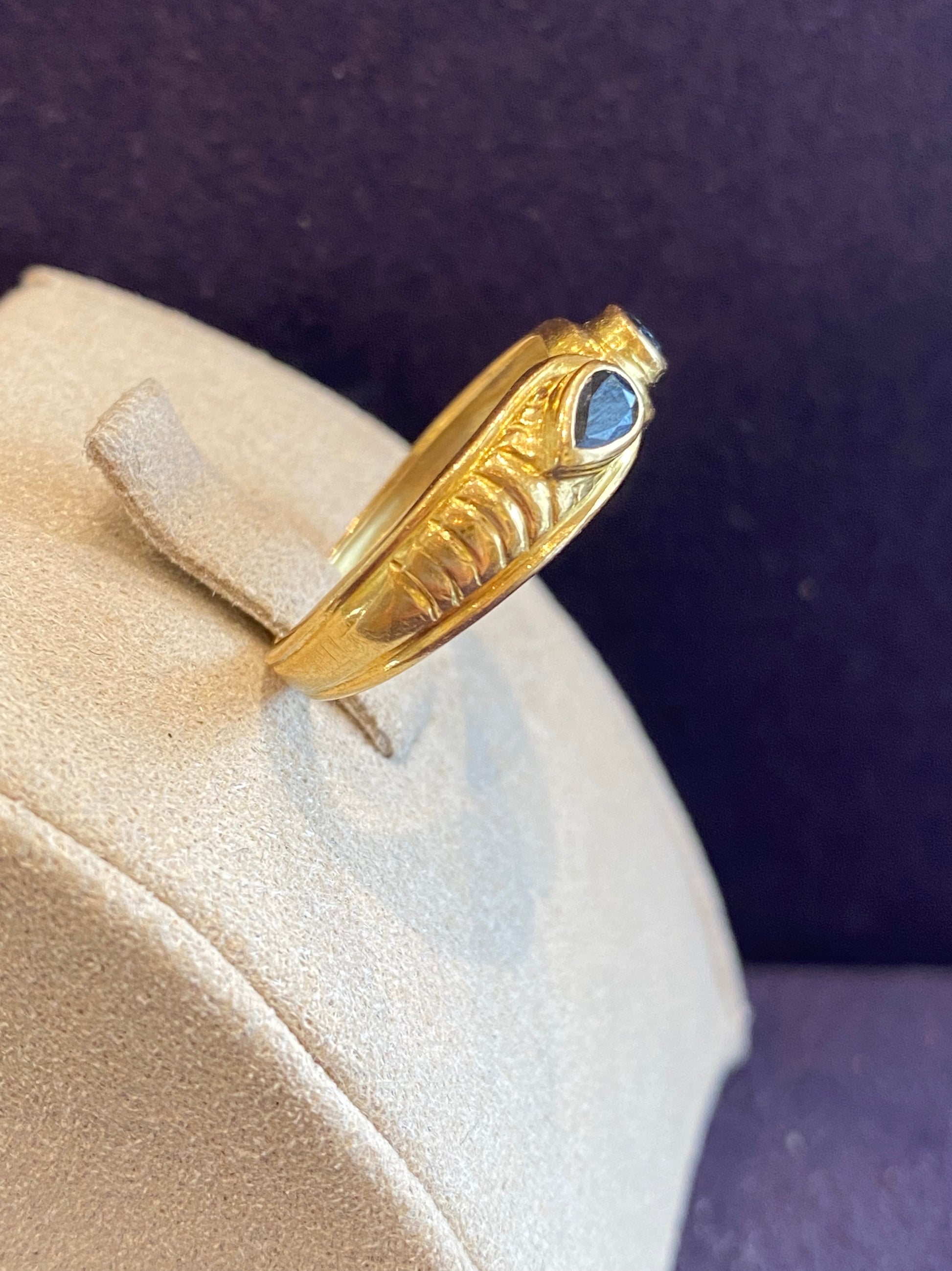 Bague en or jaune ornée de deux saphirs poire en serti clos, la monture à bordure godronnée. Dans le goût de Ilias Lalaounis.
