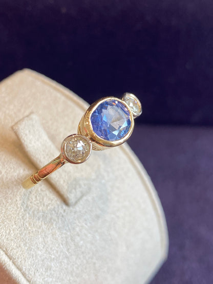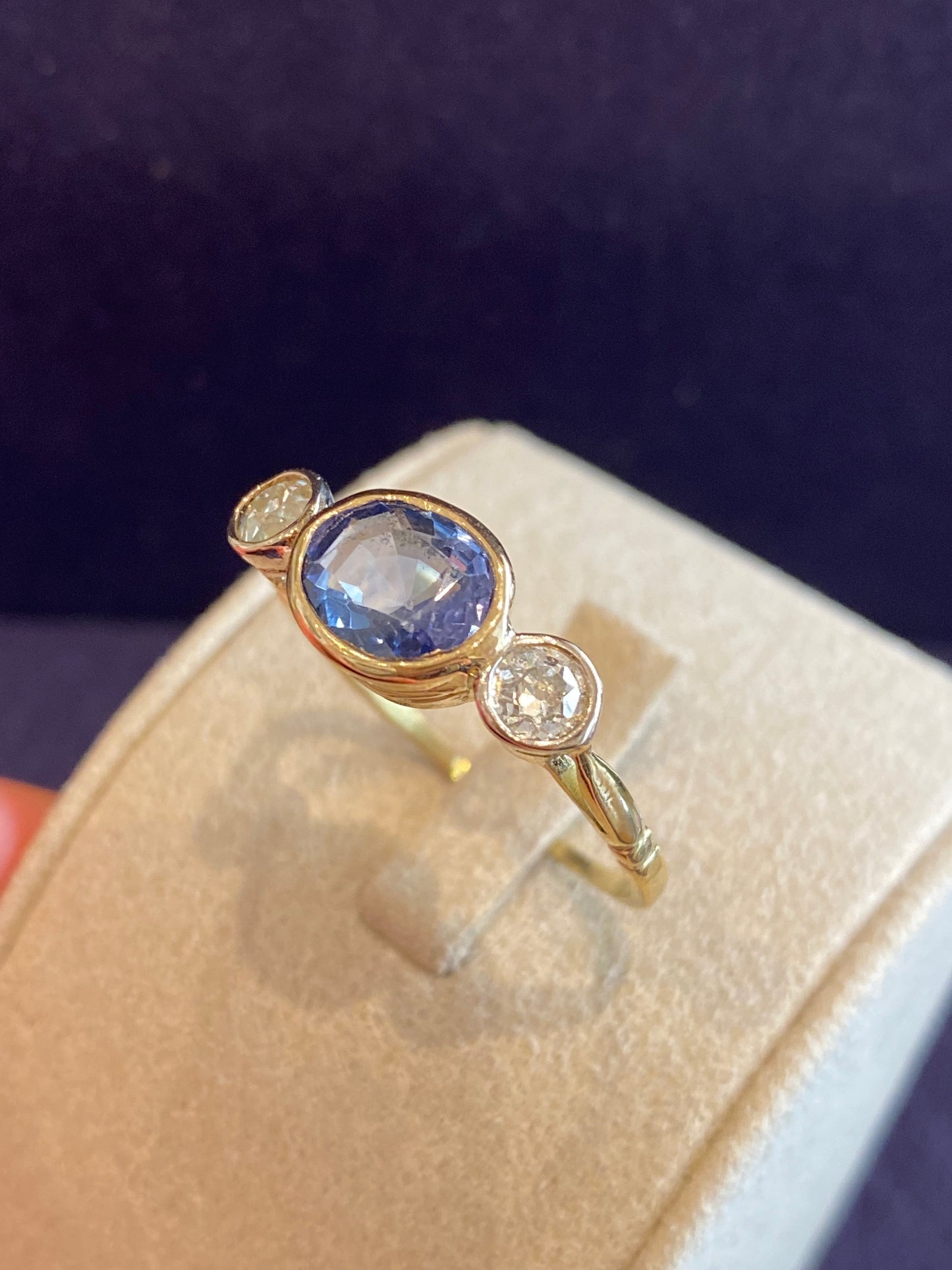Délicate bague ancienne deux ors ornée en son centre d'un saphir épaulé de deux diamants taille ancienne en serti clos