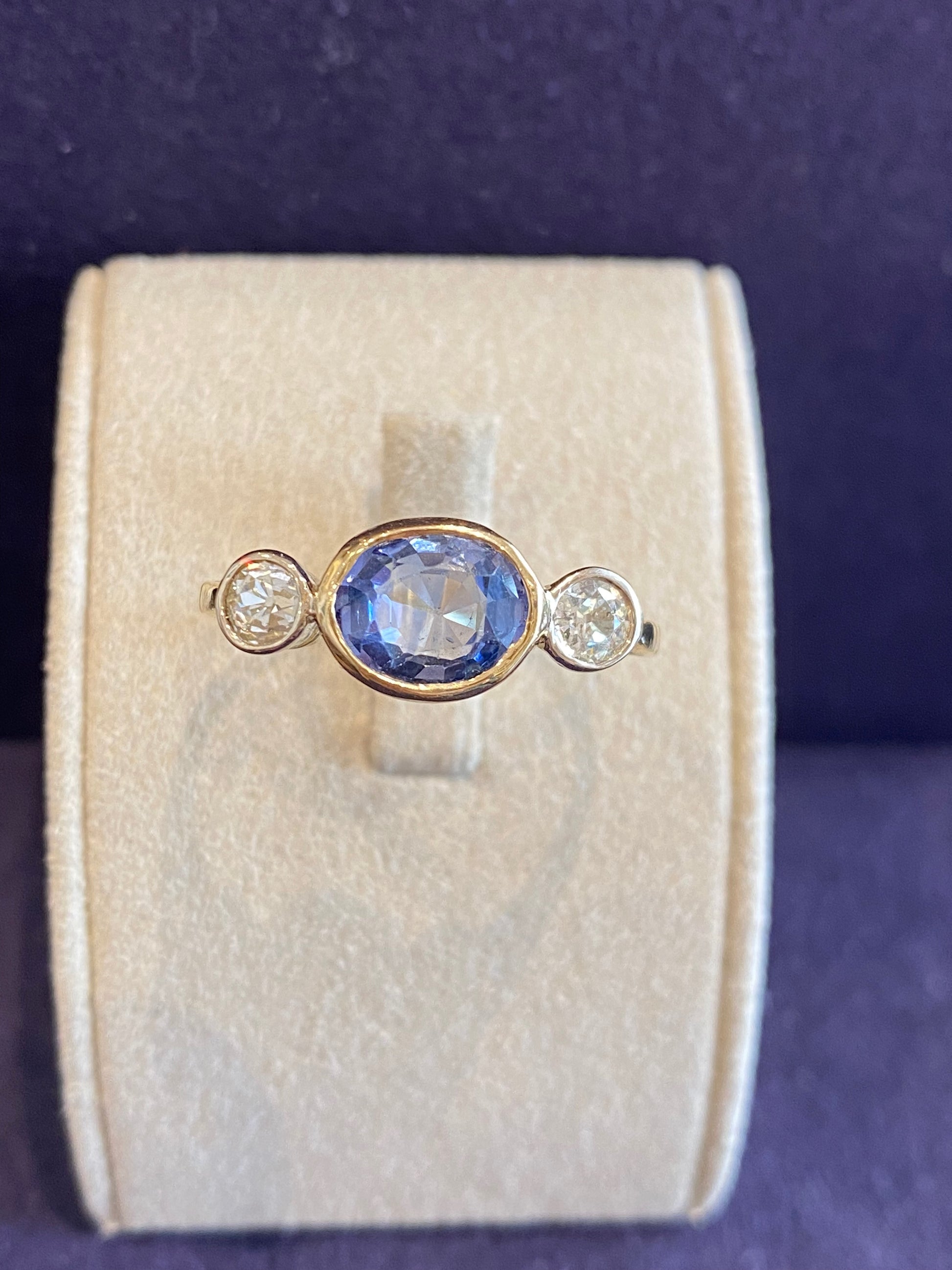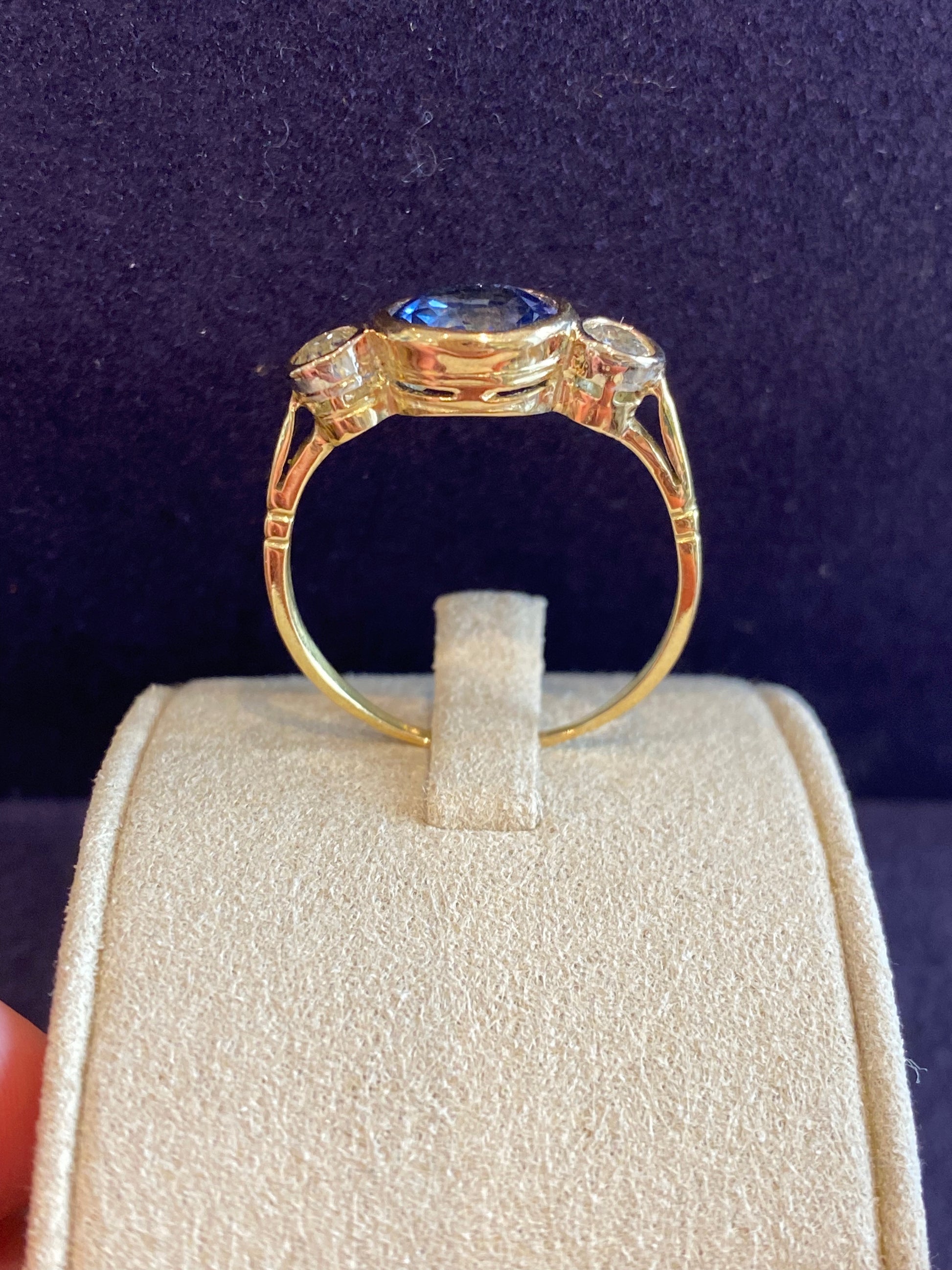Nature des pierres : deux diamants taille ancienne (poids total env. 0,56 carats) et un saphir taille ovale (poids total env. 2,97 carats).