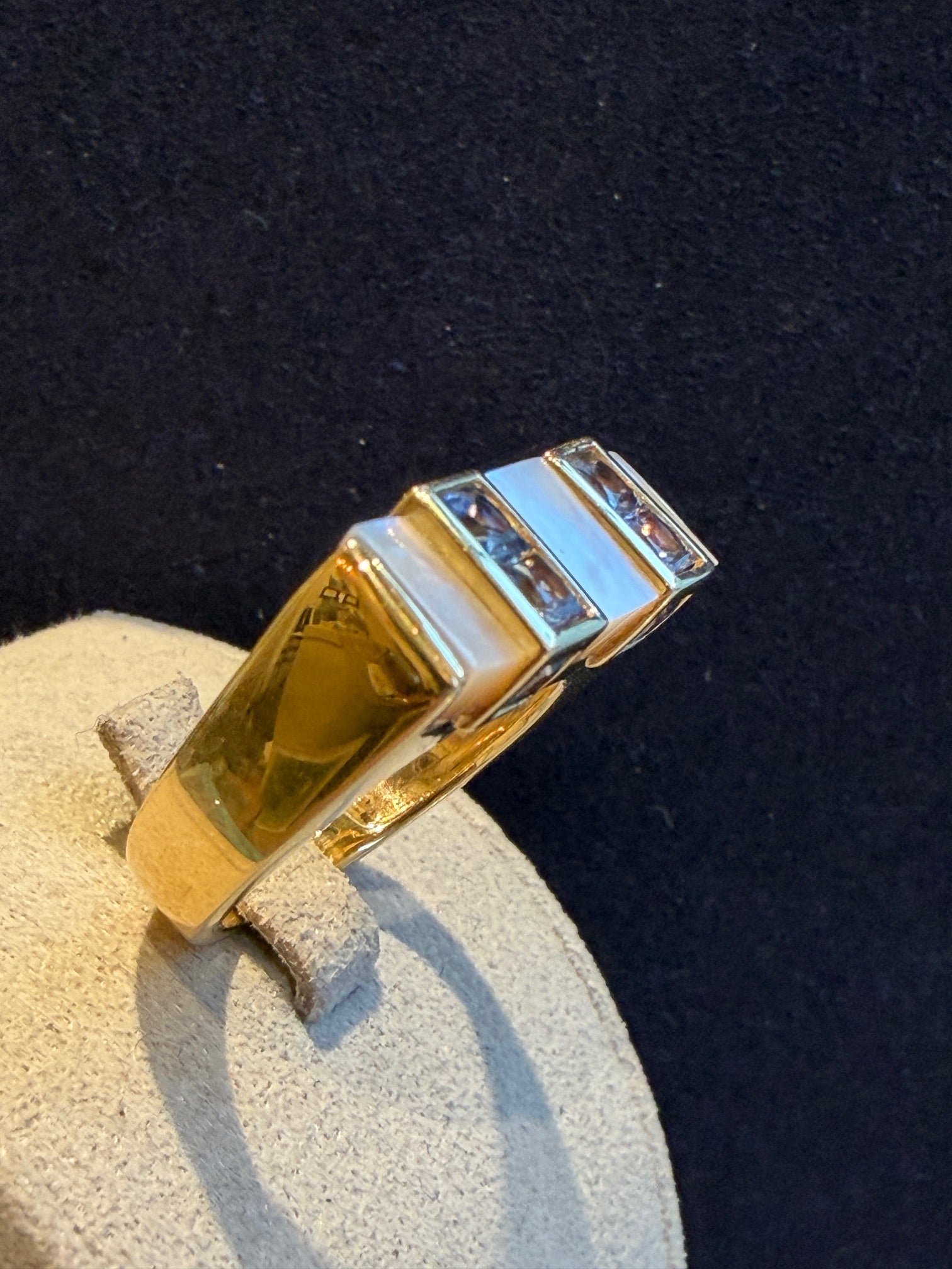 Exquisite modernist ring in yellow gold, the rectangular setting adorned with eight square-cut sapphires alternating with three pieces of mother-of-pearl.