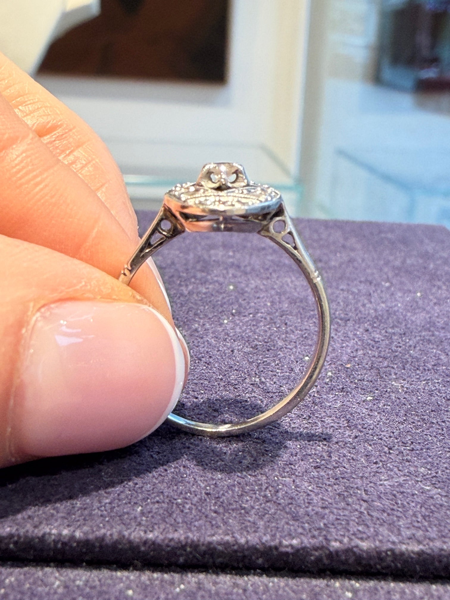 A delicate Art Deco marquise-shaped ring in white gold and platinum, set in the center with an old-cut diamond surrounded by small rose-cut diamonds.