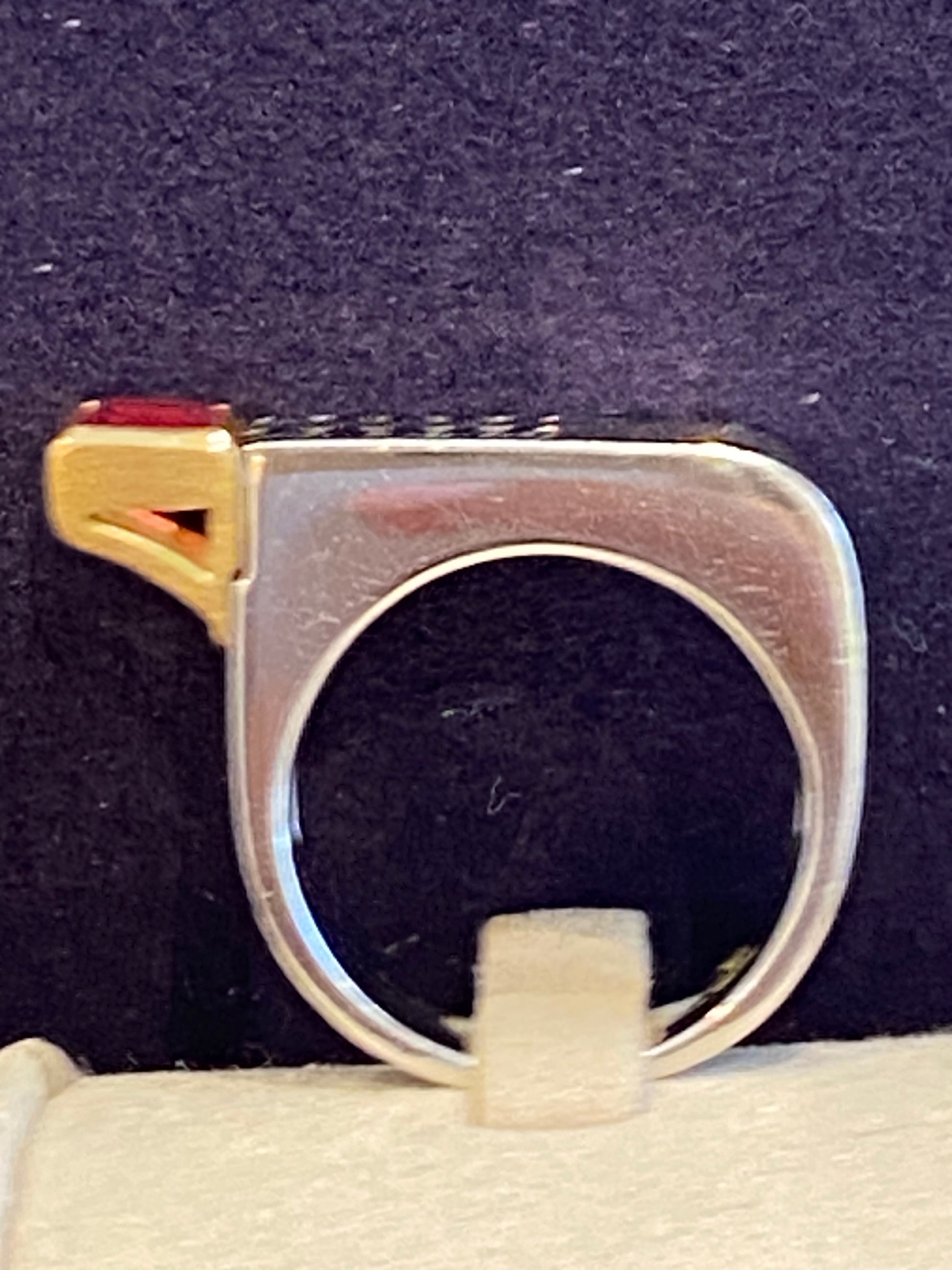 🇬🇧Powerful modernist ring in white and yellow gold adorned with two rows of black diamonds and a rhodonite.