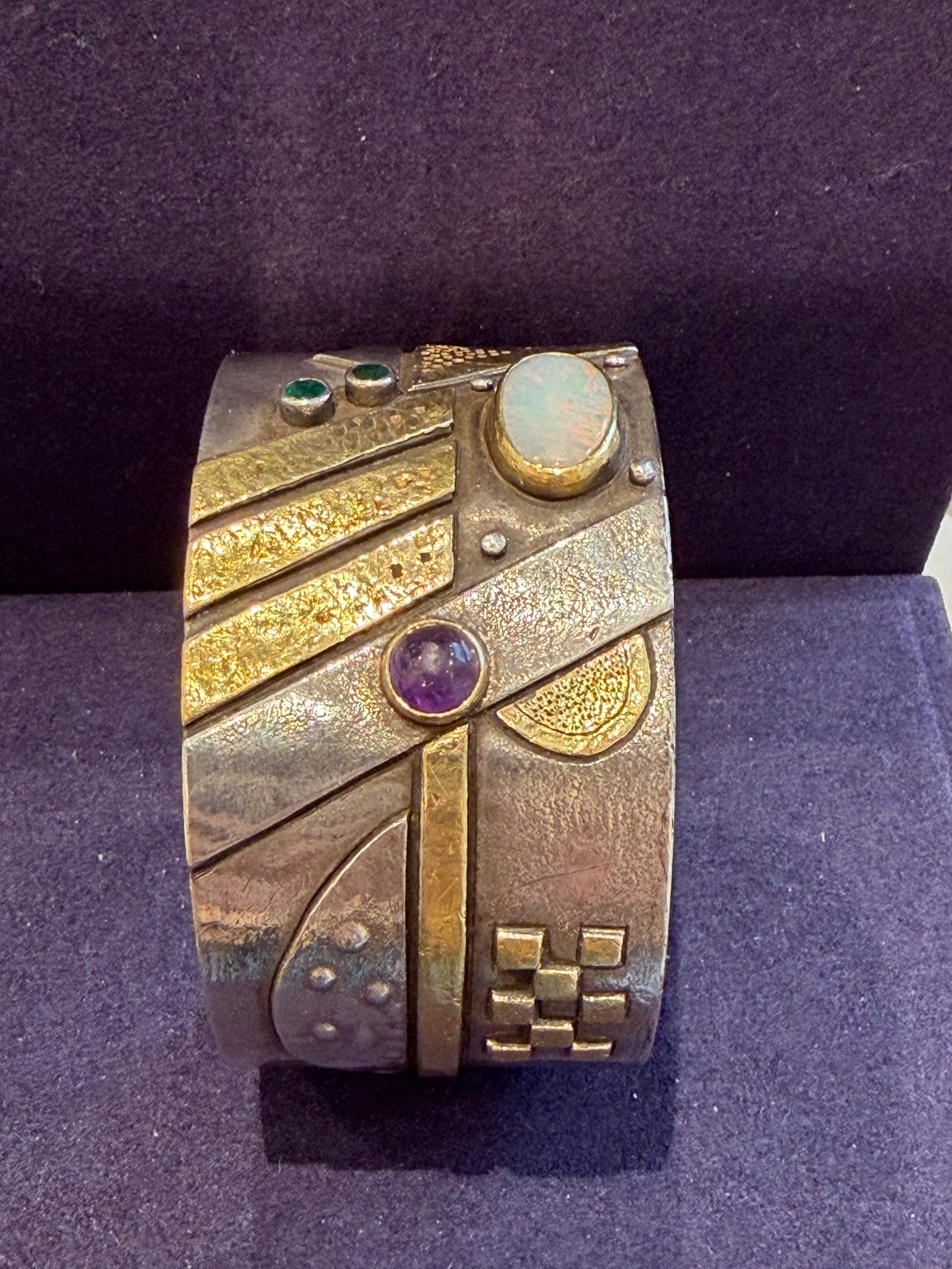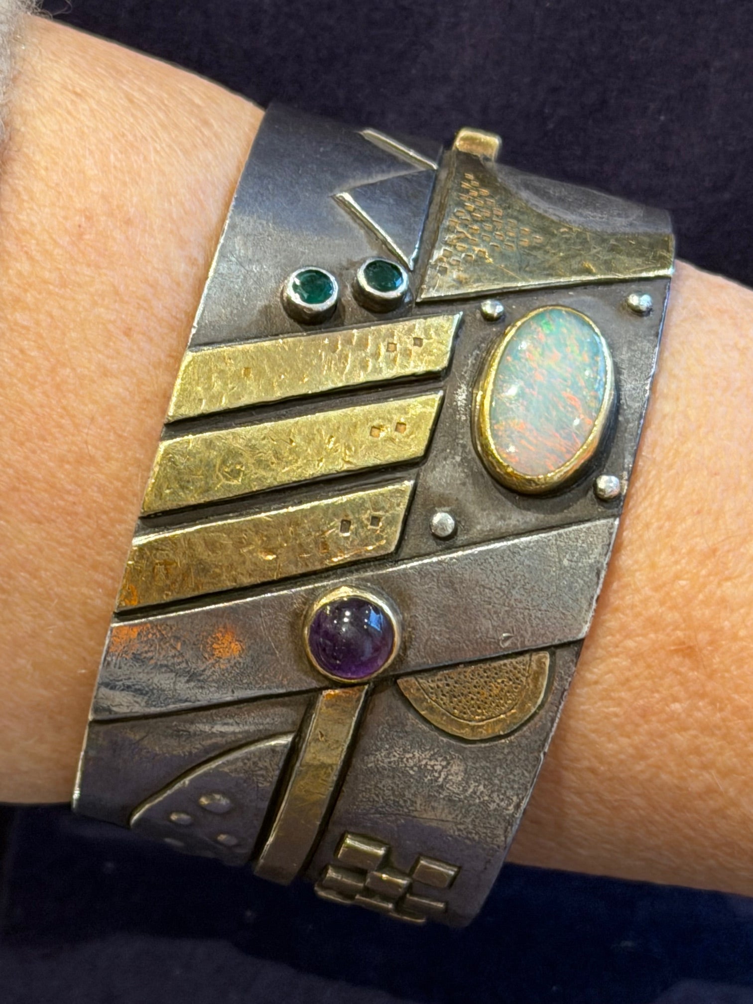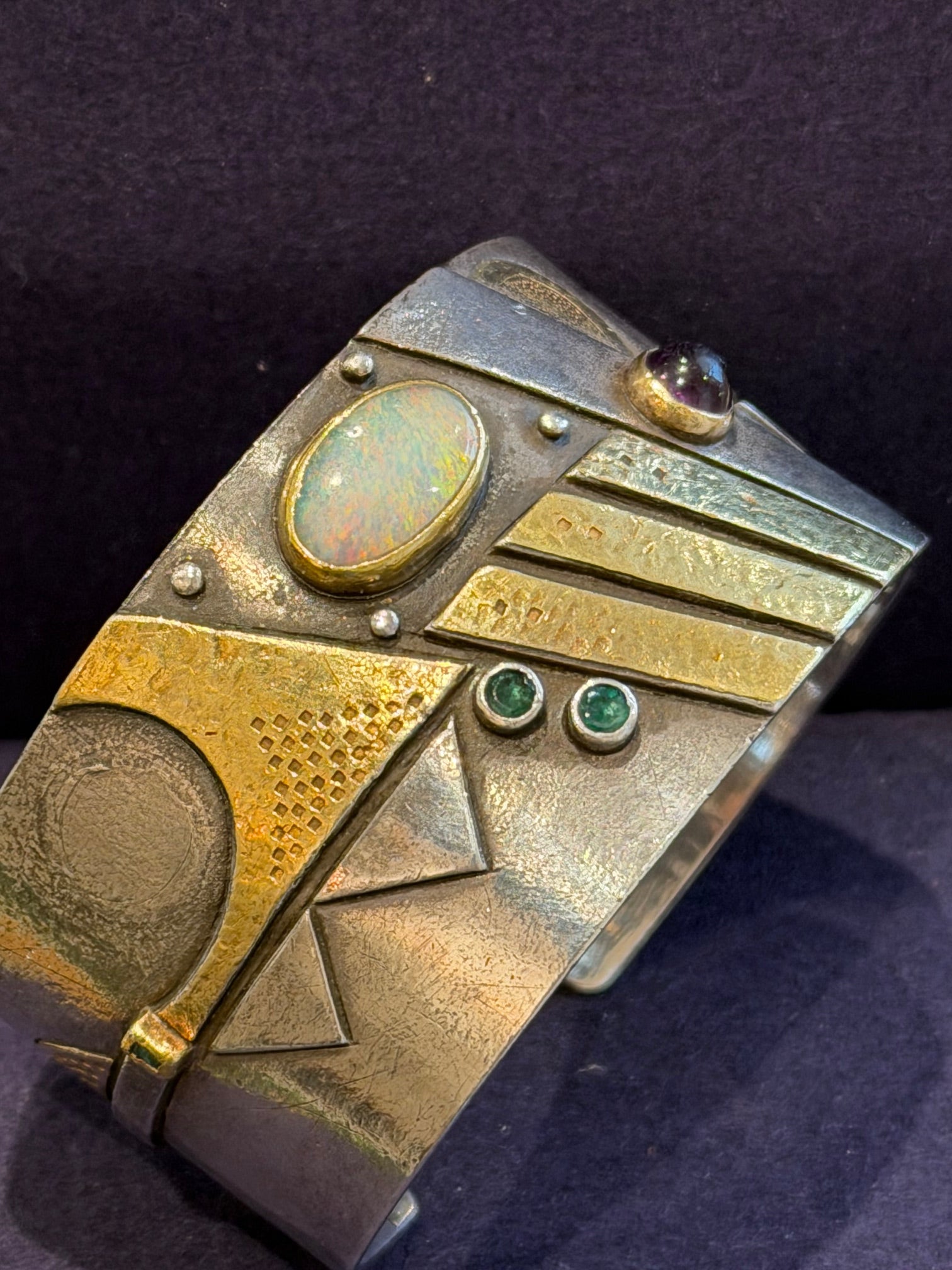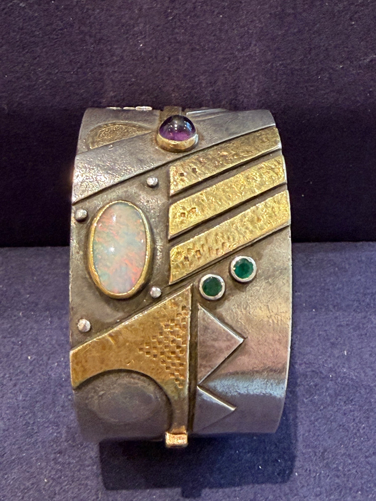 🇬🇧Exceptional Linda Ladurner cuff bracelet (1957) in sterling silver, yellow gold, and gemstones with modernist motifs,