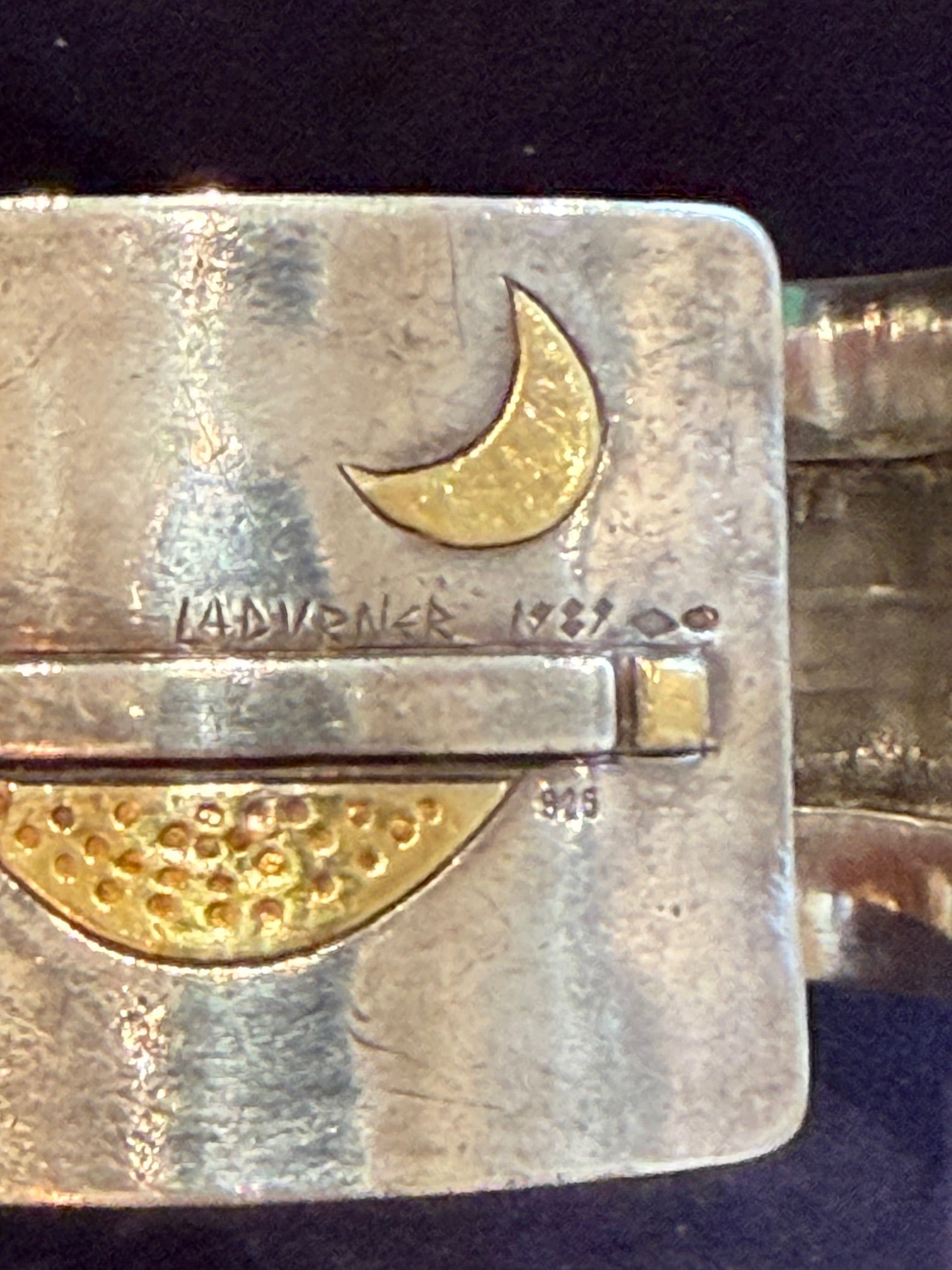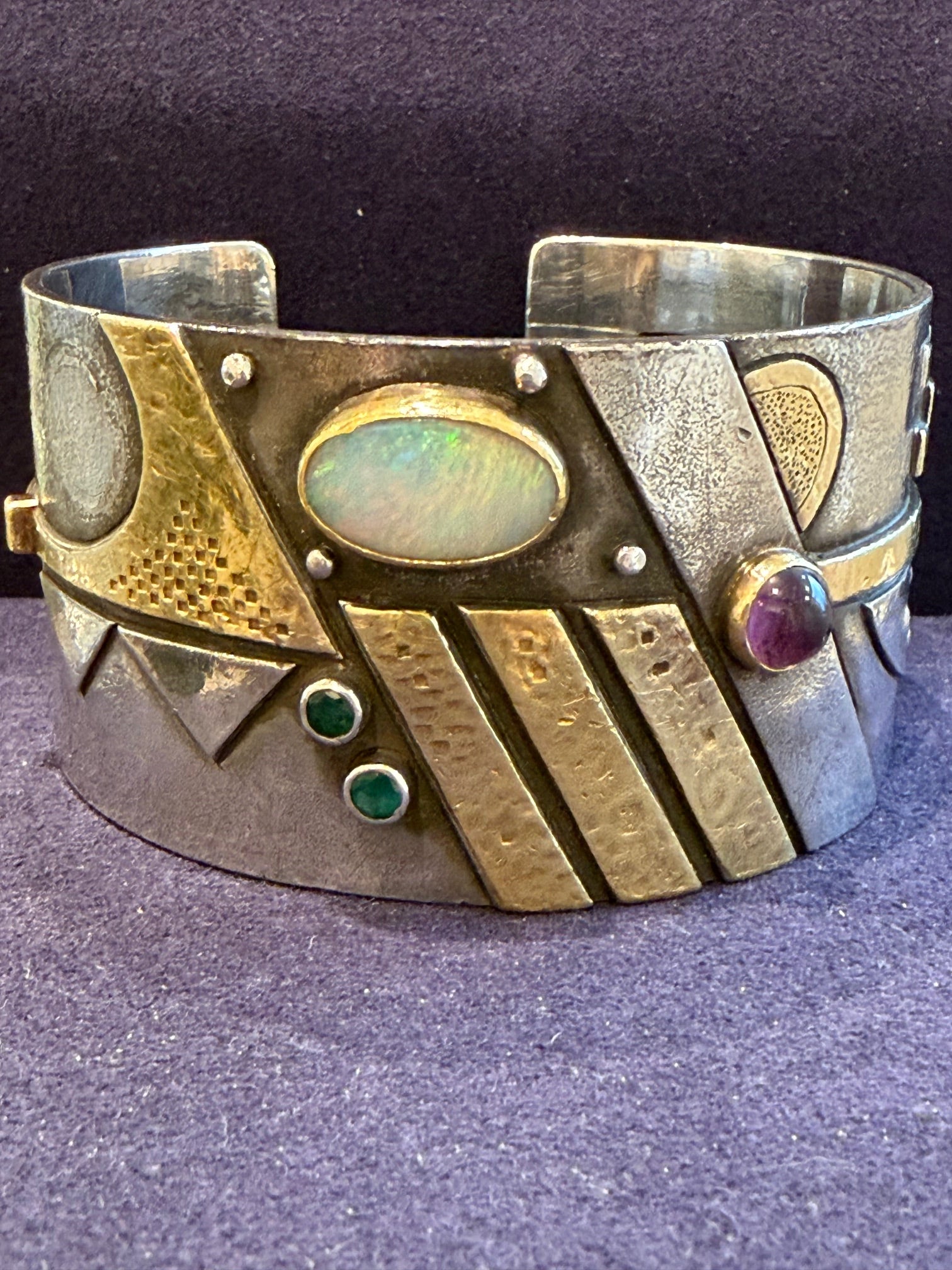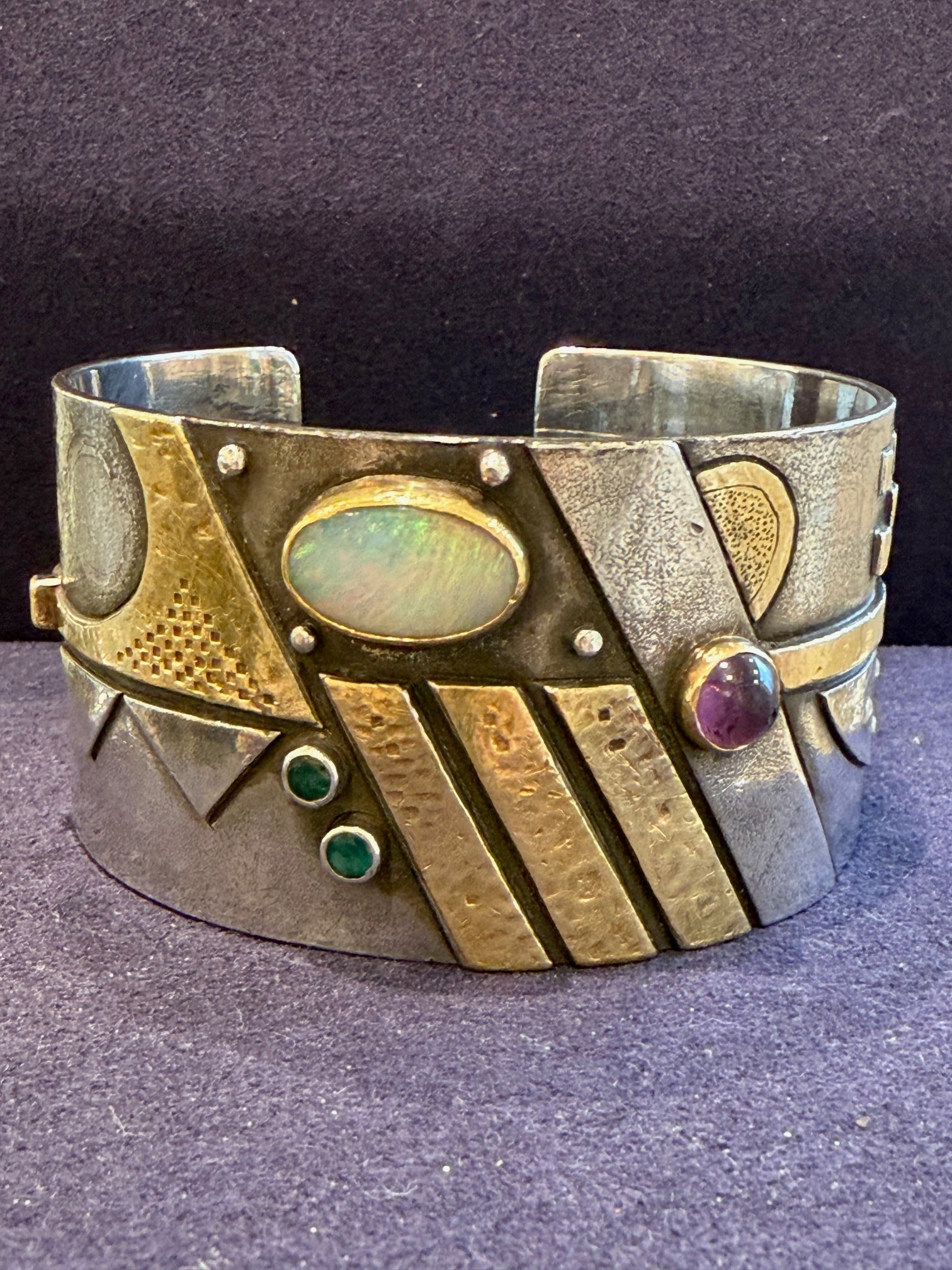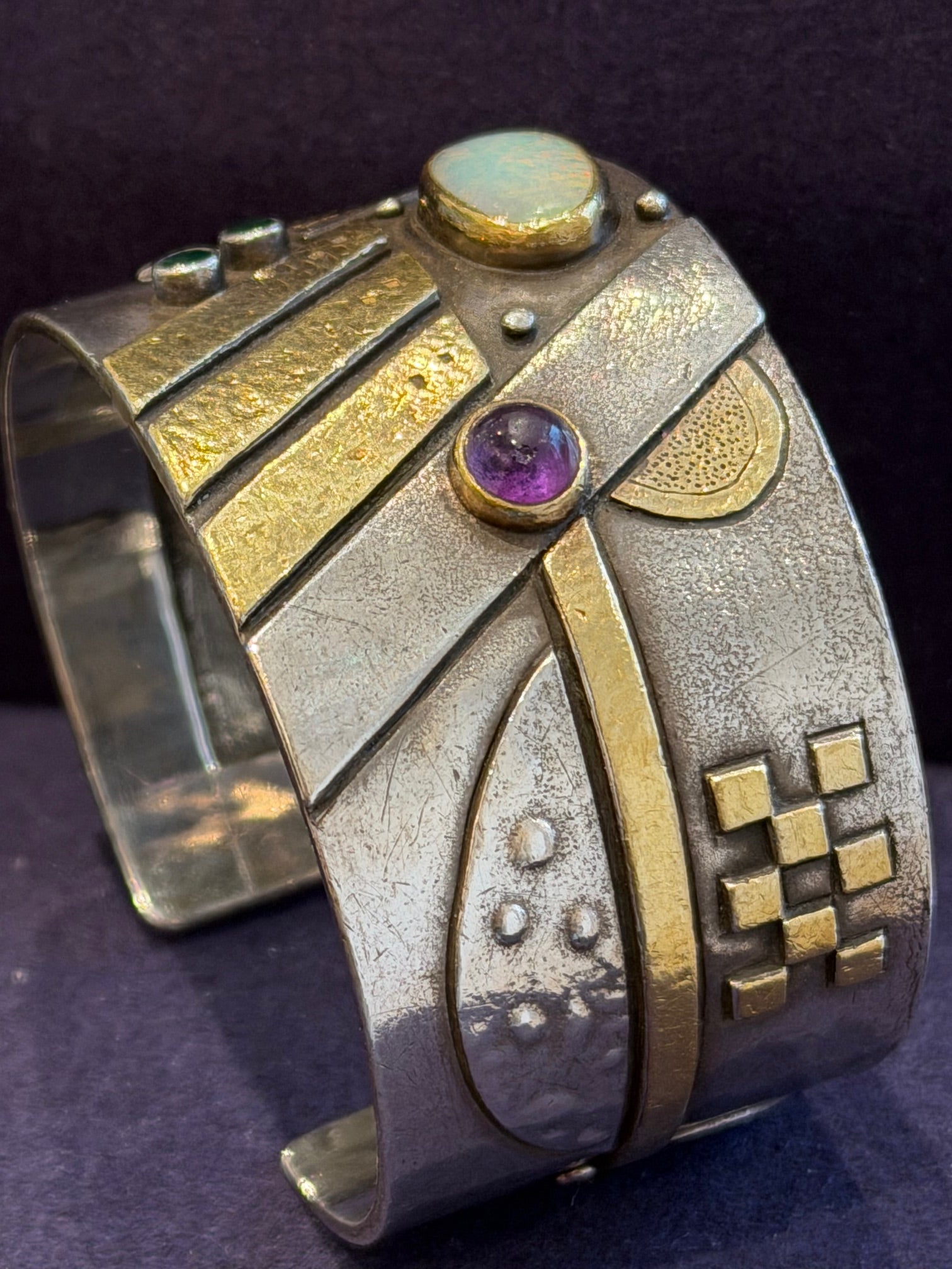 🇬🇧Exceptional Linda Ladurner cuff bracelet (1957) in sterling silver, yellow gold, and gemstones with modernist motifs,