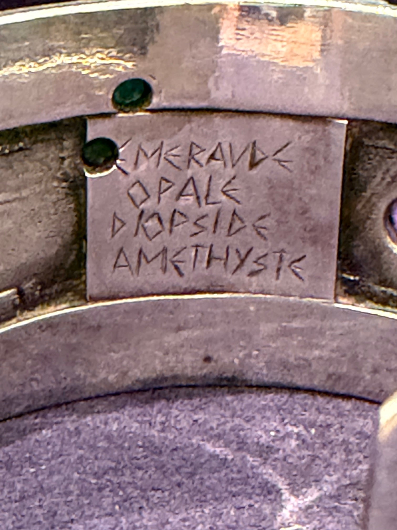 Gemstones : emeralds, opal, diopside, and amethyst.