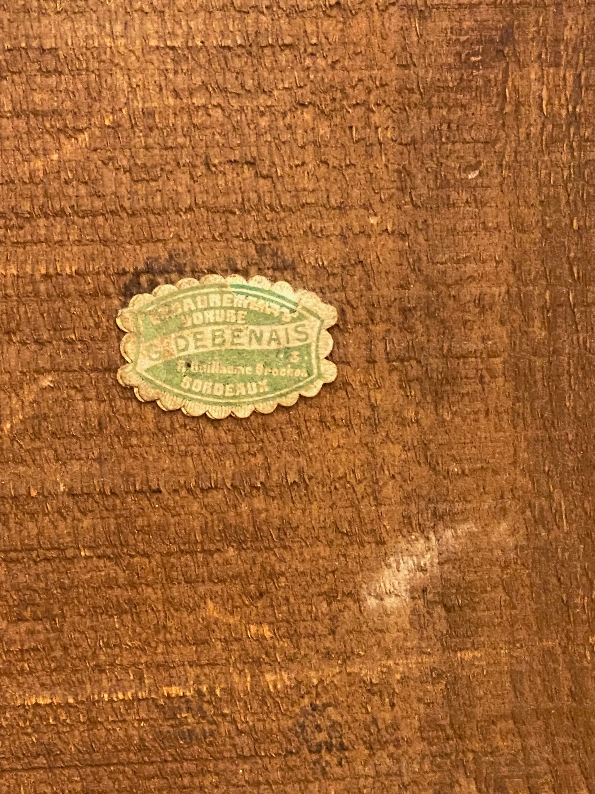 Bears a label on the back from the establishment "G. Debenais 8 rue Guillaume-Brochon, Bordeaux"
