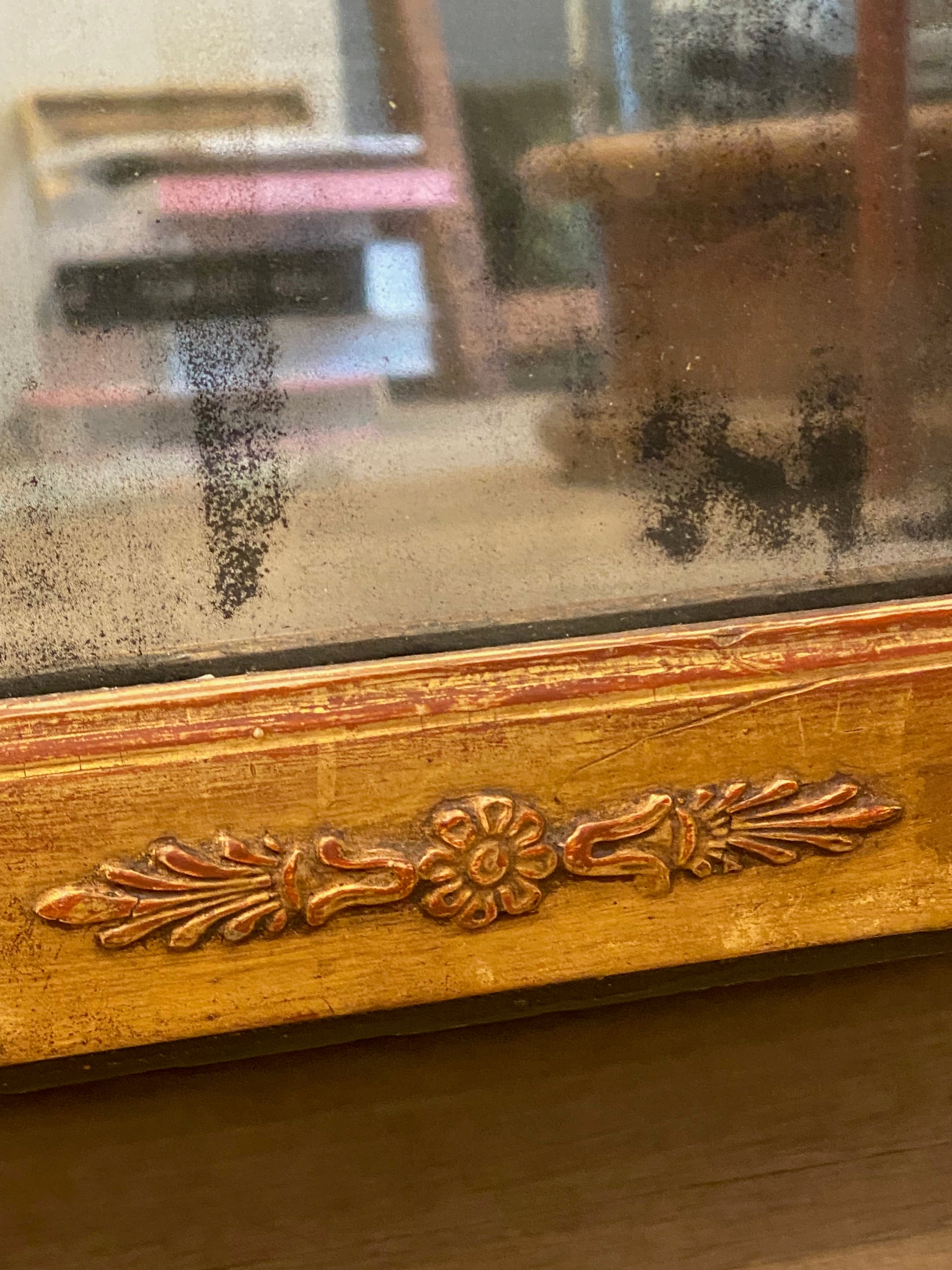 Délicat miroir trumeau en bois doré à décor gris souris/marron foncé
