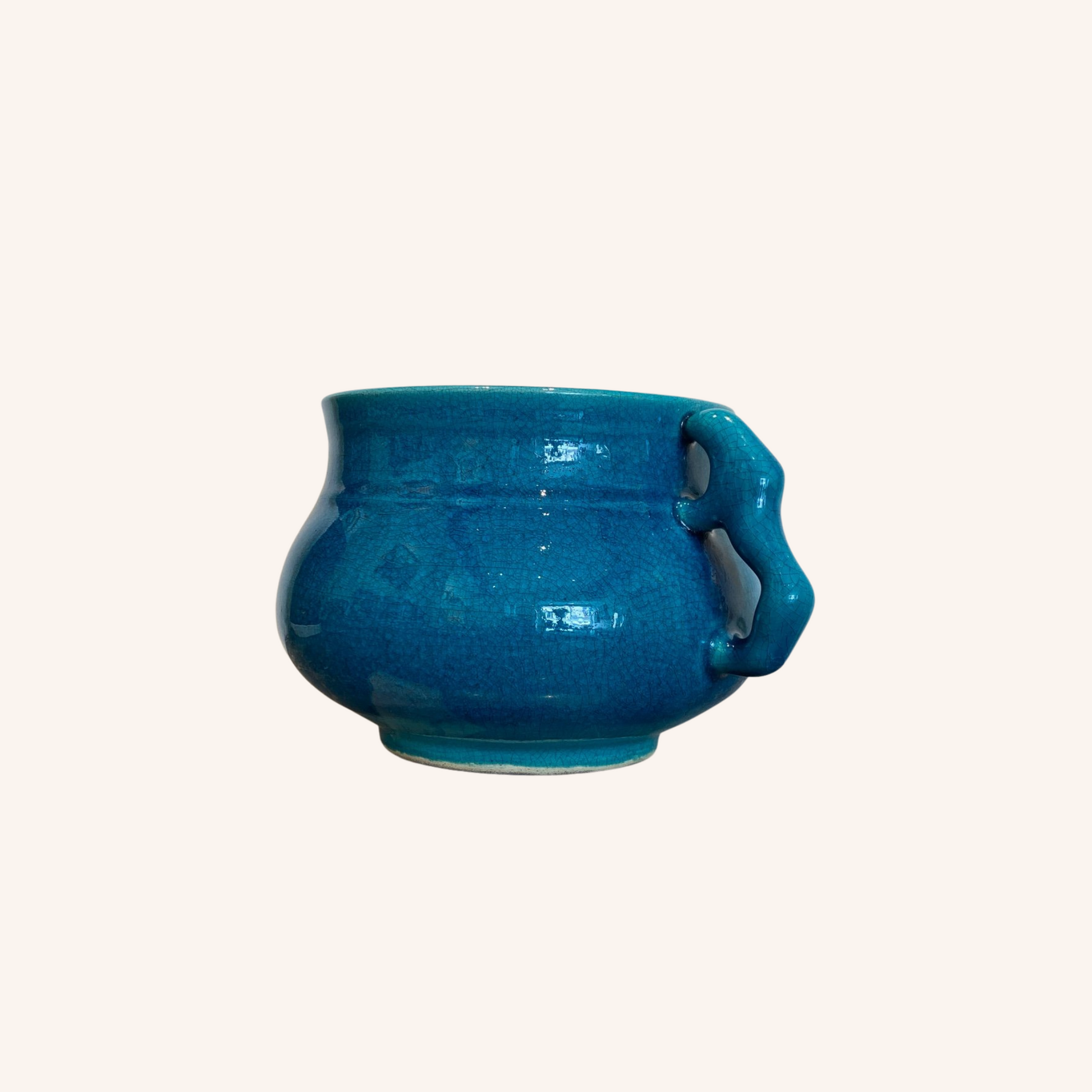 Magnifique coupe aux anses animalières stylisées, en céramique à décor d'émaux bleus chinois craquelés