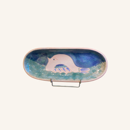 Plat oblongue en céramique émaillée à motif d'un oiseau bleu se baignant dans une eau émaillée vert turquoise