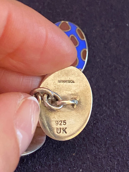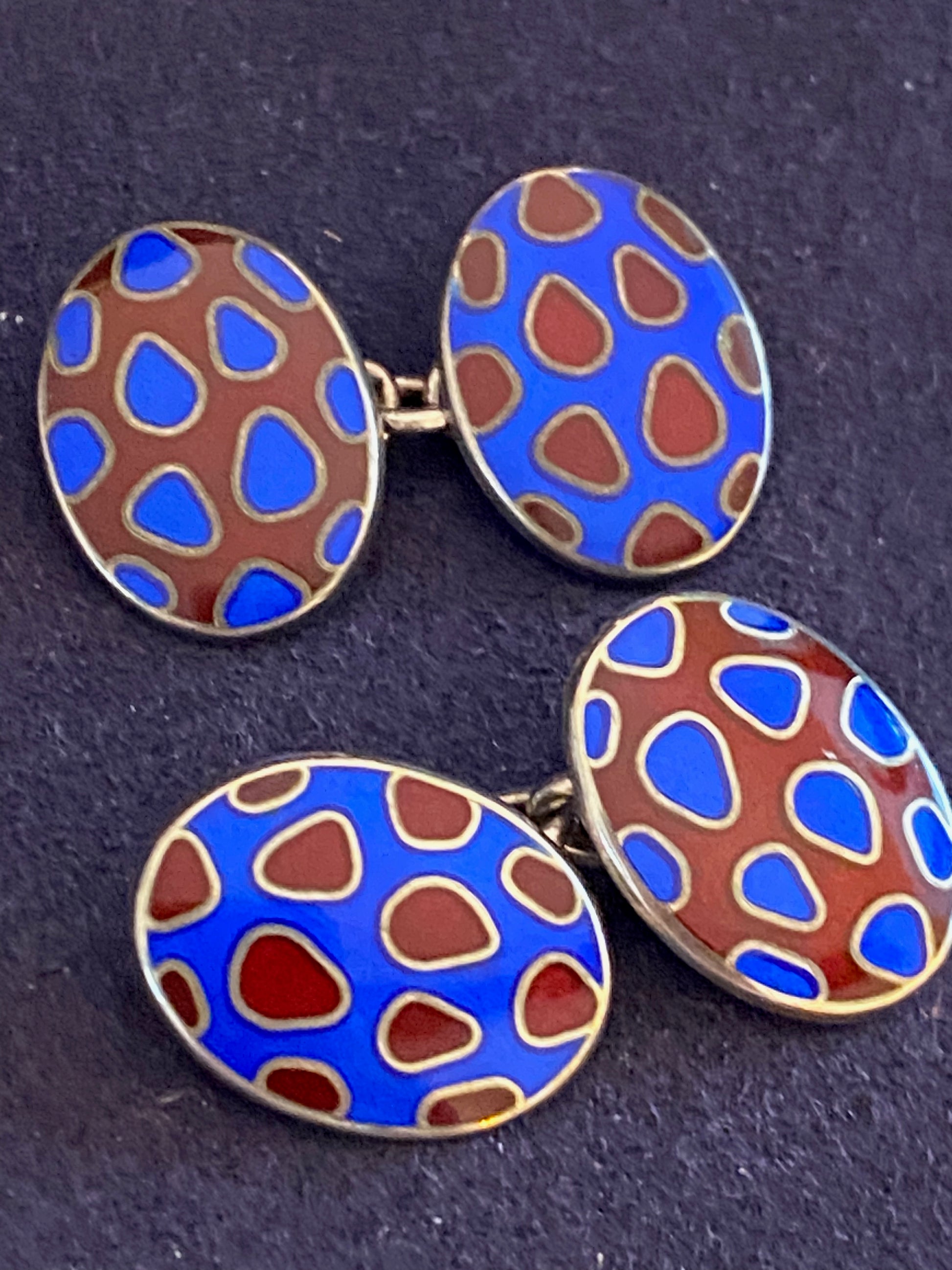 Paire de boutons de manchette en argent massif à décor d'émaux polychromes en alternance de bleu et de bordeaux.
